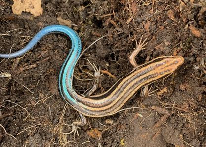 We have received some very interesting reports over the last month. A woman in Benson contacted us to report the Common Five-lined Skinks she has on her property. Common Five-lined Skinks are Vermont’s only native lizard, and all known populations are within two miles of Lake Champlain in West Haven and Benson. Her house is within that range, though we were unaware of her skinks. She sent the photo below. The bright blue tail tells us this is still a youngster.