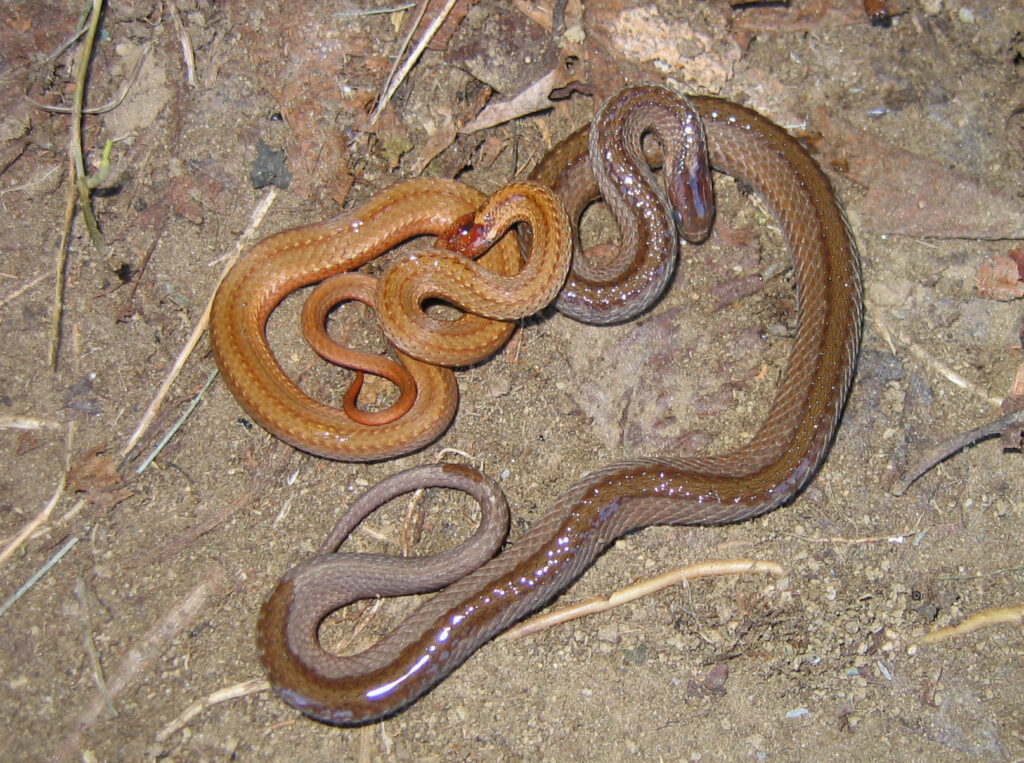 Unlike Dekay’s Brownsnakes, Red-bellied Snakes like those below have a variety of background colors. Some are shades of brown, some gray, and others are black. But they all have a red belly with three light markings on the neck.