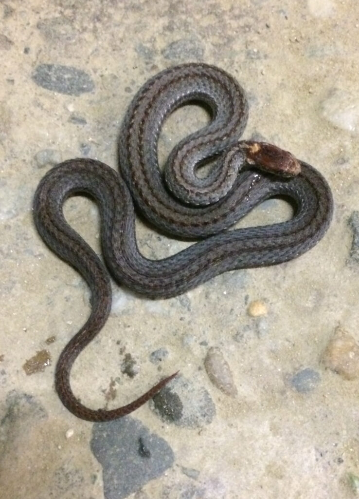 The gray Red-bellied Snake in Heather Bushey’s photo below shows the light neck markings well. There is one light mark on the back of the neck, and one on either side.