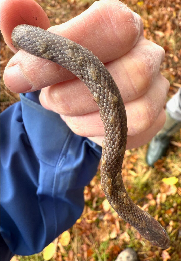 Sadly, the adult Red-bellied Snake was badly infected with what appears to be snake fungal disease. Notice the small bumps along the body of the snake below. This disease was first diagnosed in 2006 in New Hampshire Timber Rattlesnakes, but has since been seen in 23 states and many other snake species. Most snakes survive minor infections, but the disease has reduced populations of some rare snakes.